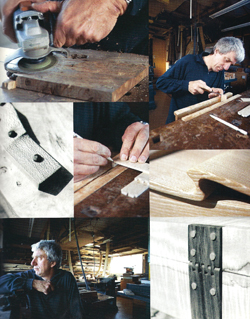 "Making boxes is a bit like making bread" says Peter, "only it stretches over about six years rather than six hours". An important part of the process is drying the wood and Peter leaves his outside for two to three years, brings it into his workshop for several more years and lets it rest for several weeks between each stage of construction. "There are two times when wood looks beautiful" claims Peter. "The first is when a newly felled tree is fed into a saw mill and a slab falls off showing the grain, swirling and colour. The second is when you start sanding the wood. But, during the intervening years it's grey and boring".